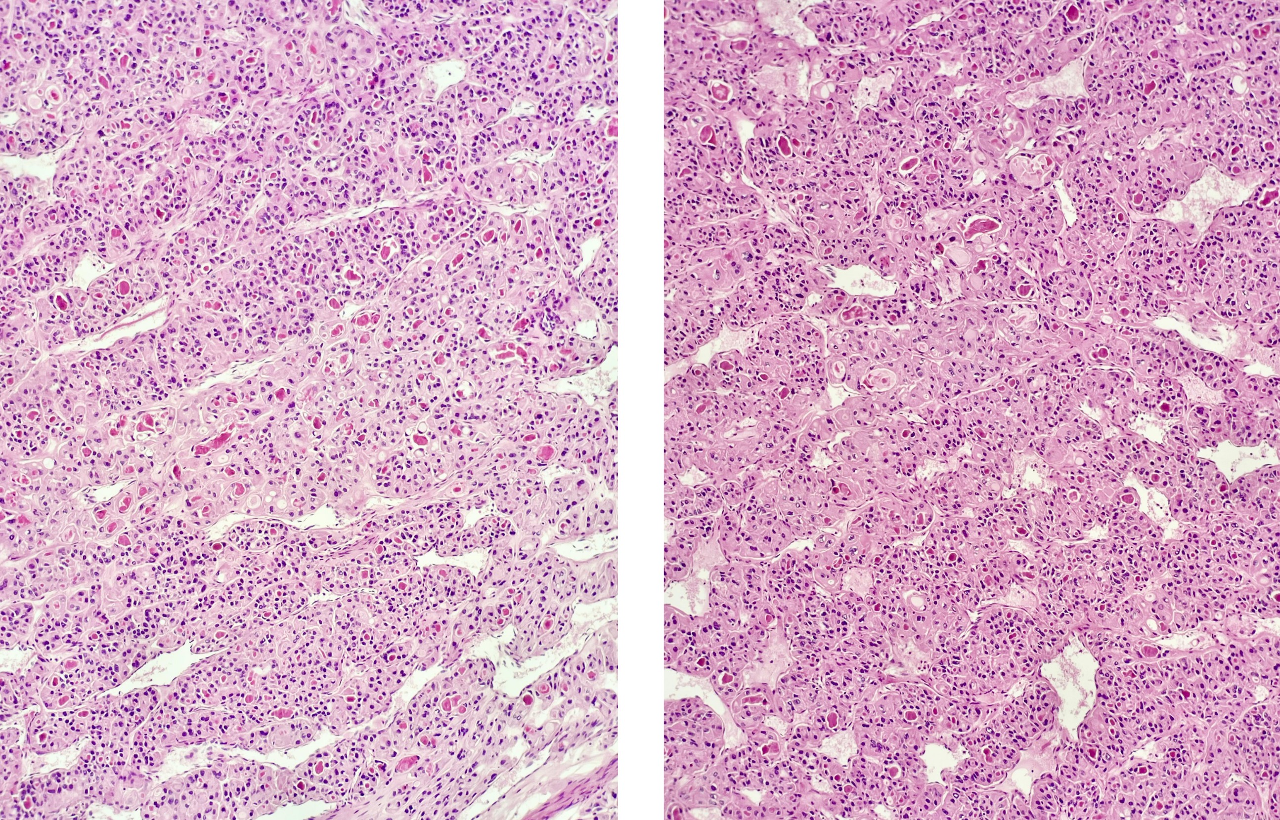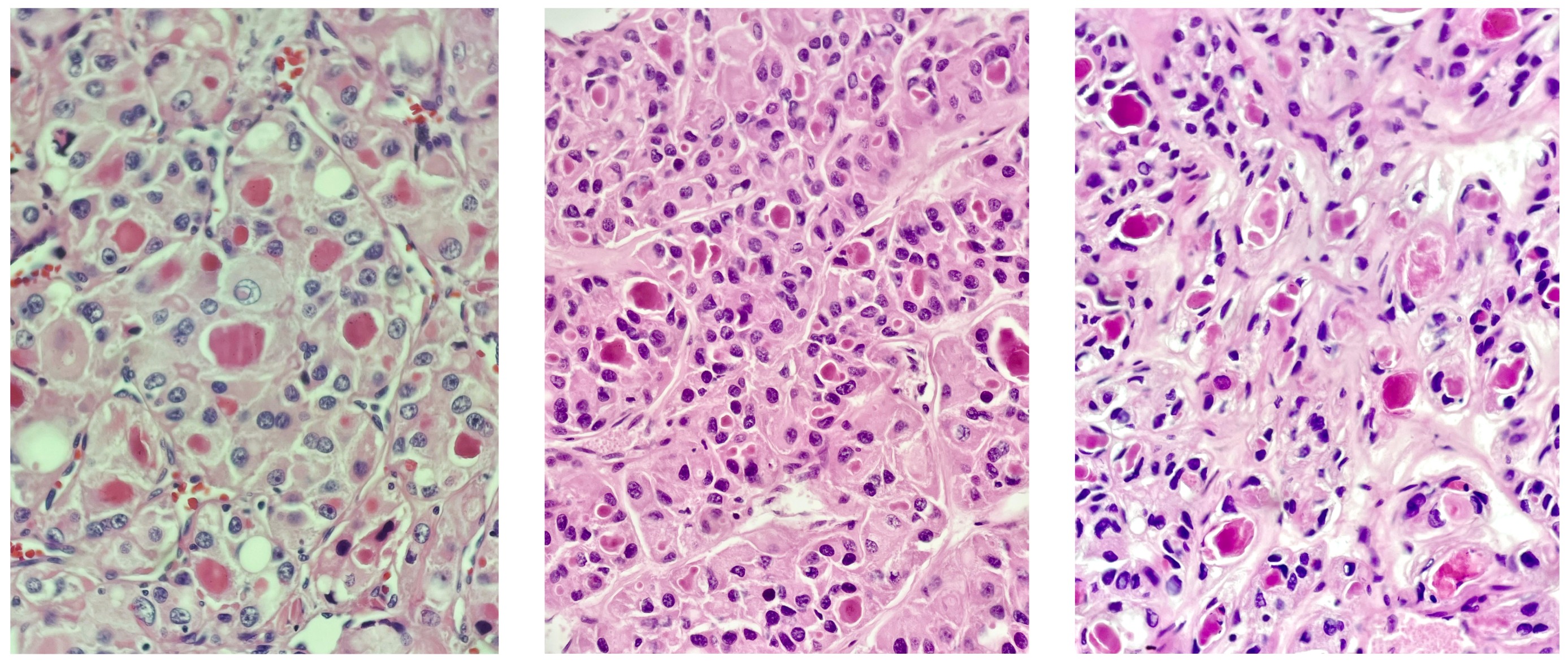 c) Positividad fuerte y difusa para calcitonina y cromogranina A