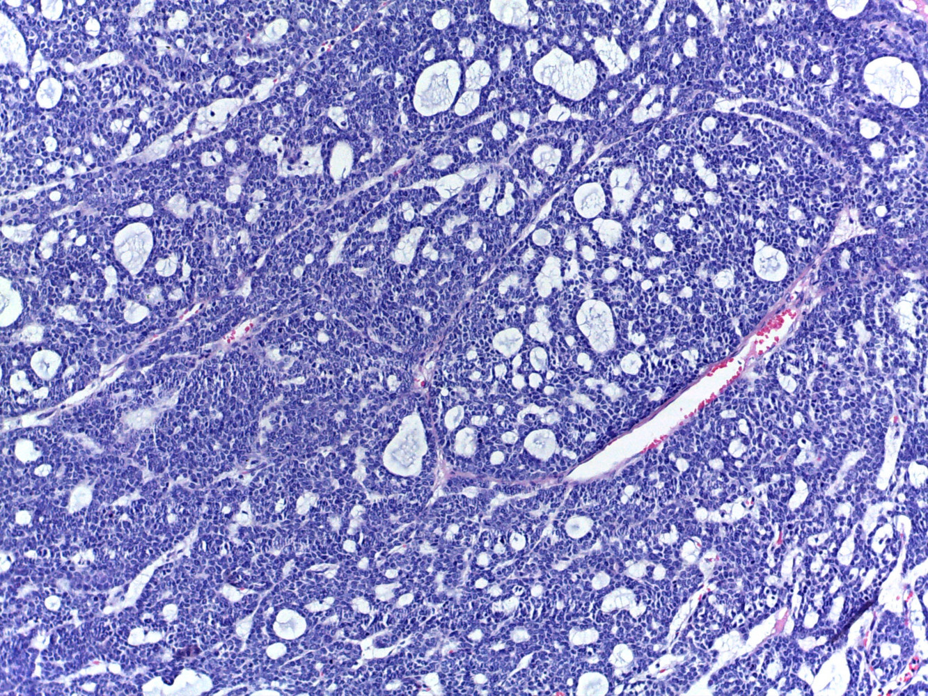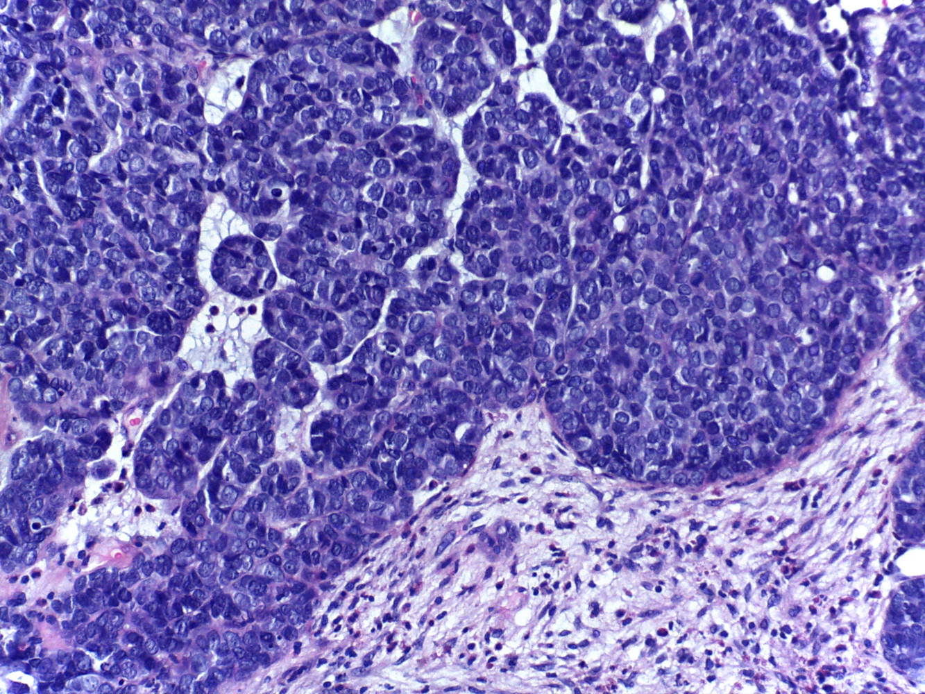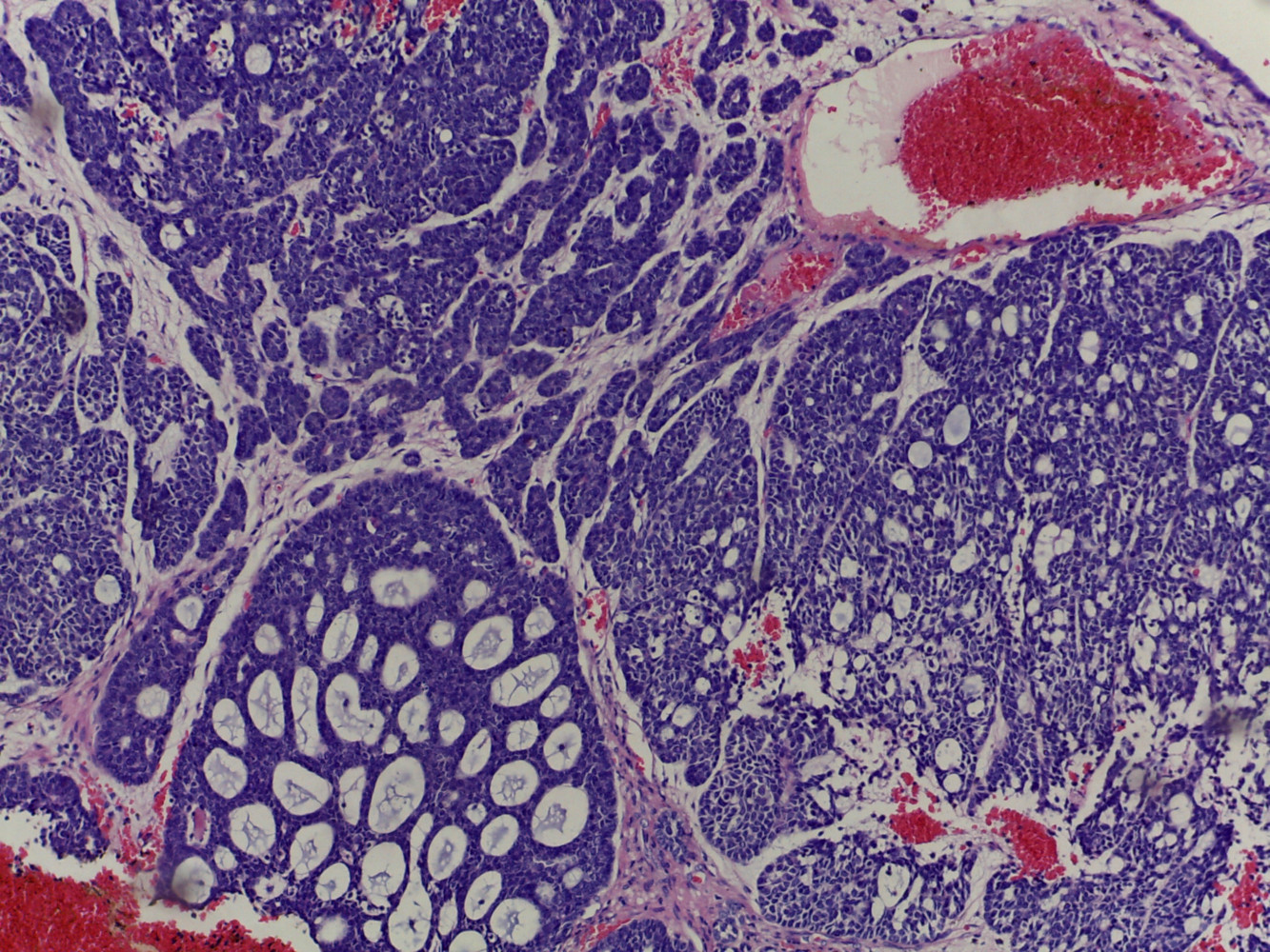Comentario: Anteriormente conocido como carcinoma con características semejantes al carcinoma adenoideo quístico asociado a VPH, este carcinoma se ha descrito hasta ahora solamente en tracto sinonasal, tiene características histológicas semejantes al carcinoma adenoideo quístico con componente cribiforme y tubular y un componente de carcinoma epidermoide in situ en el epitelio superficial . Todos los casos descritos están asociados a infección por VPH .