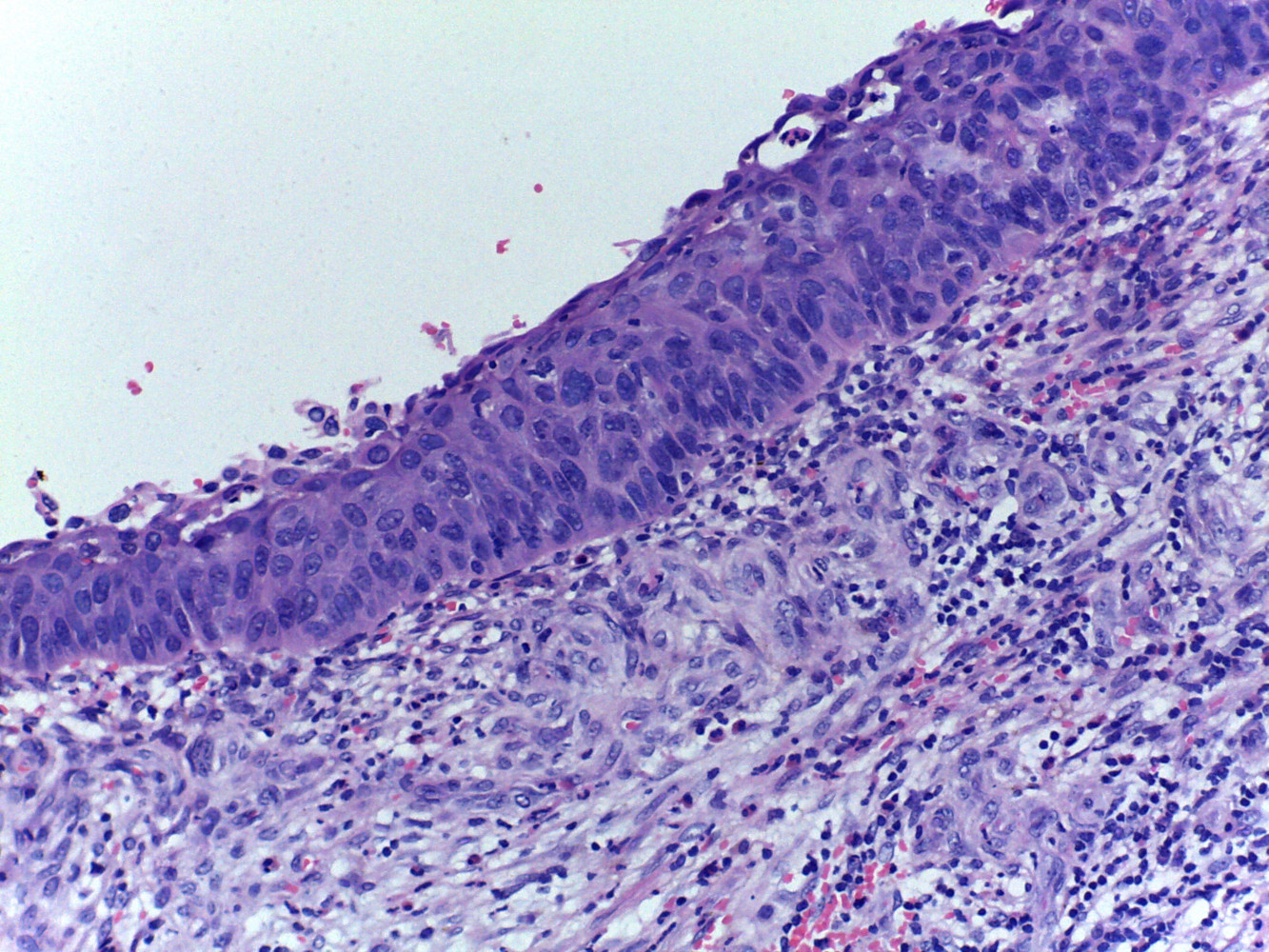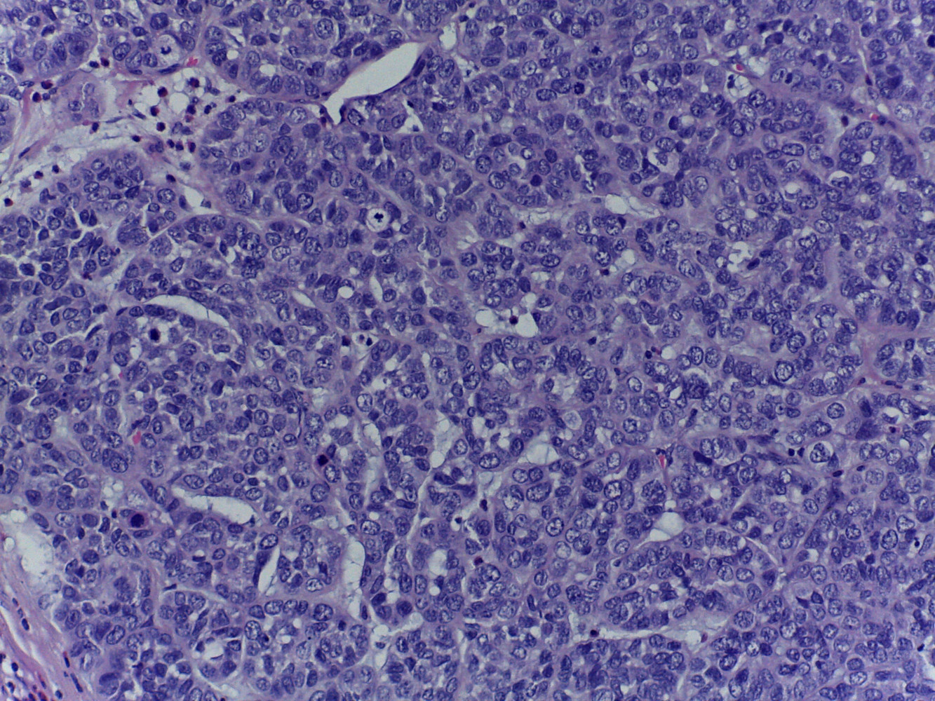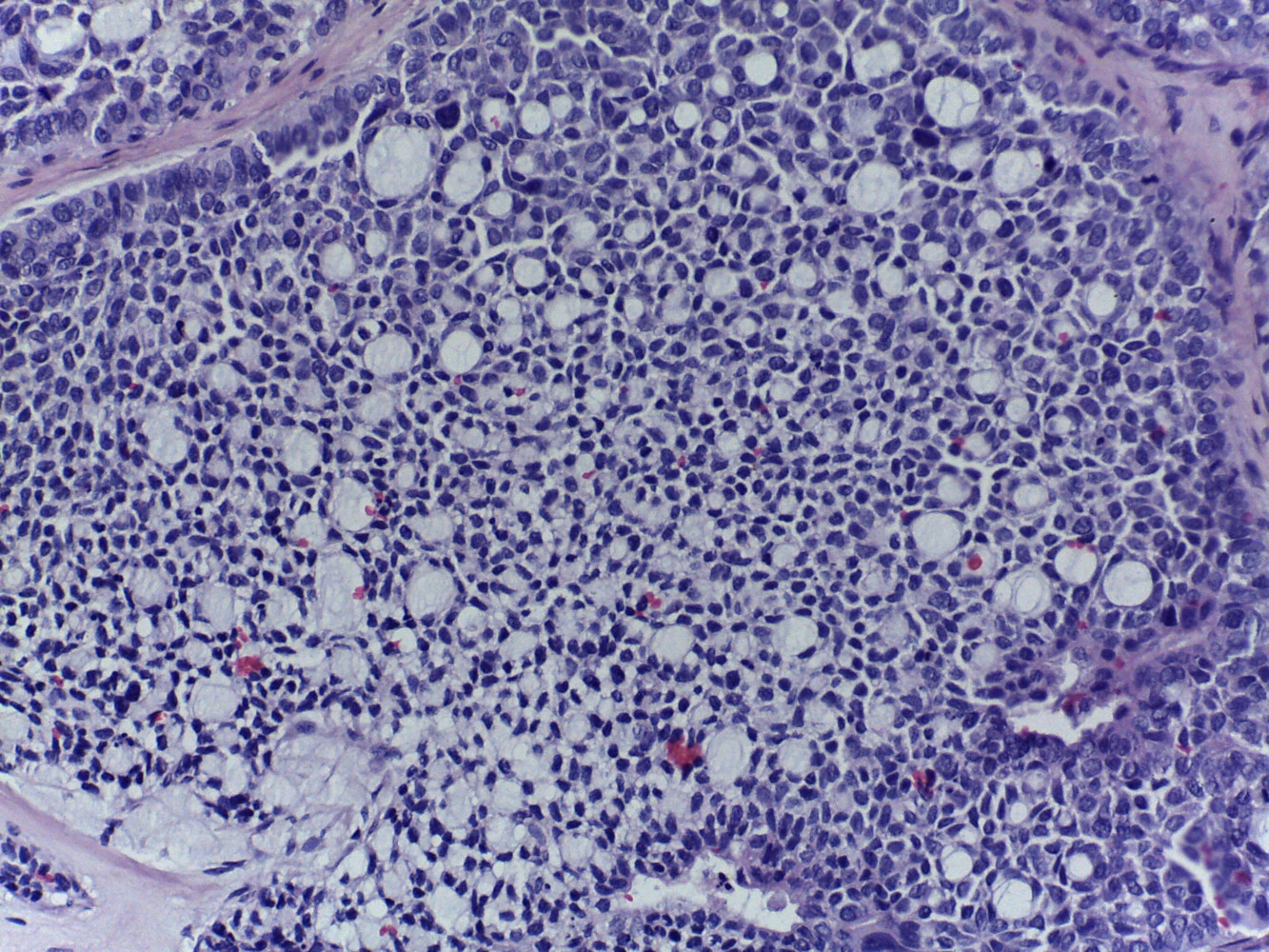 Comentario: Anteriormente conocido como carcinoma con características semejantes al carcinoma adenoideo quístico asociado a VPH, este carcinoma se ha descrito hasta ahora solamente en tracto sinonasal, tiene características histológicas semejantes al carcinoma adenoideo quístico con componente cribiforme y tubular y un componente de carcinoma epidermoide in situ en el epitelio superficial . Todos los casos descritos están asociados a infección por VPH .