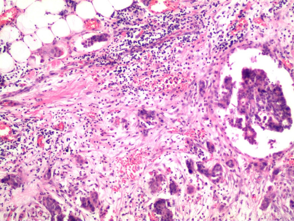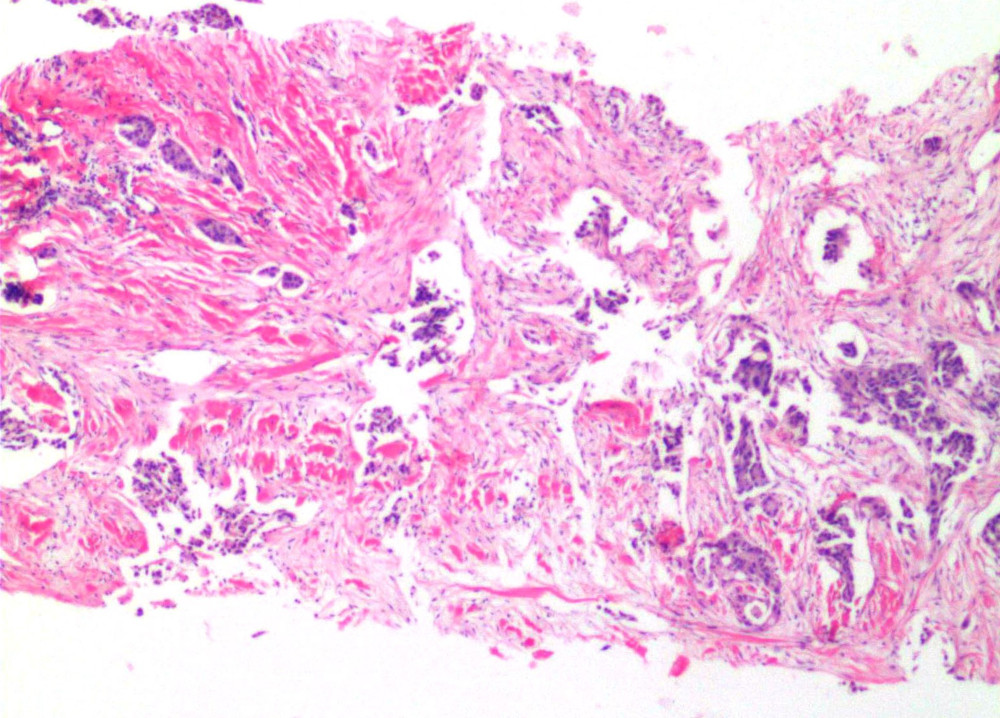 Adenocarcinoma invasor, predominantemente acinar con áreas micropapilares, no mucoproductor primario de pulmón, con extensión a pleura y tejidos blandos.