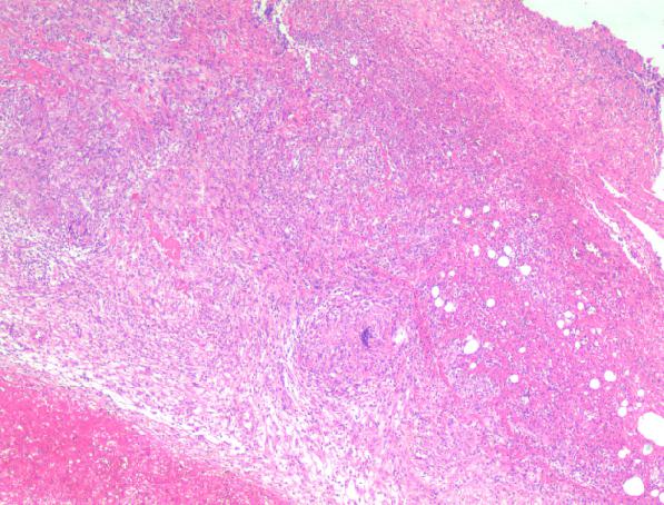 Presentó malestar general, tos, hipertermia no cuantificada, escalofríos, dolor abdominal tipo cólico intensidad 7/10, e hiporexia. Persistió con dolor abdominal y se agregó ascitis, alteración del peritoneo, hepatomegalia y realce nodular hepático heterogéneo y pérdida de peso. En LAPE se encontró peritoneo engrosado con micronodulaciones, además de ovario izquierdo aumentado de tamaño.