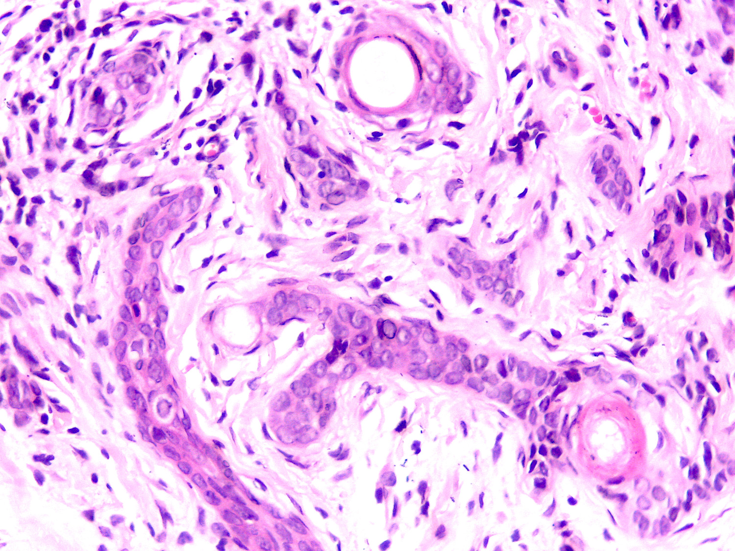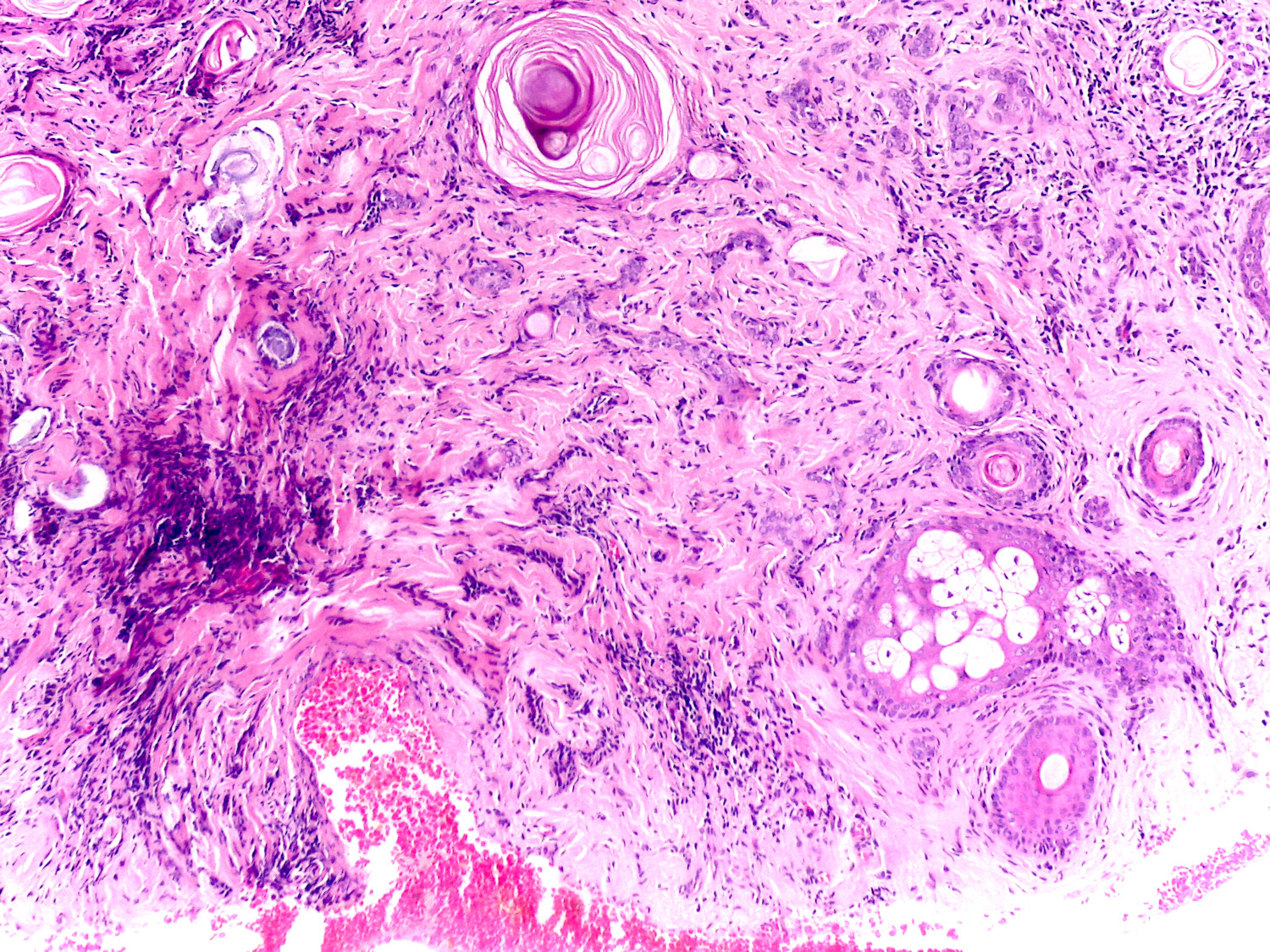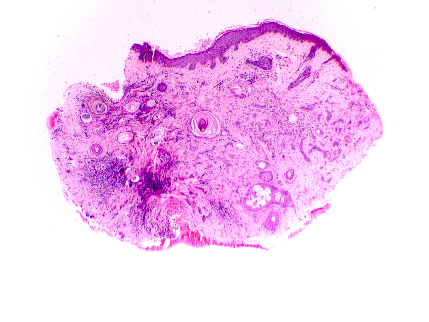 Mujer de 45 años, dermatosis localizada que afecta la mejilla, constituida por neoformación de borde elevado y centro deprimido, seis años previos en limpieza facial, fue manipulada y quemada. Clínicamente se consideró el diagnóstico de hiperplasia sebácea gigante vs carcinoma basocelular por presentar telangeictasias.
