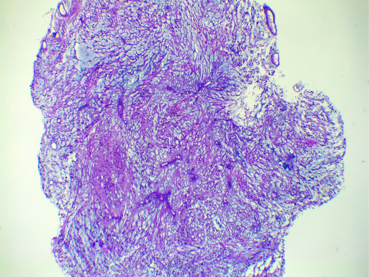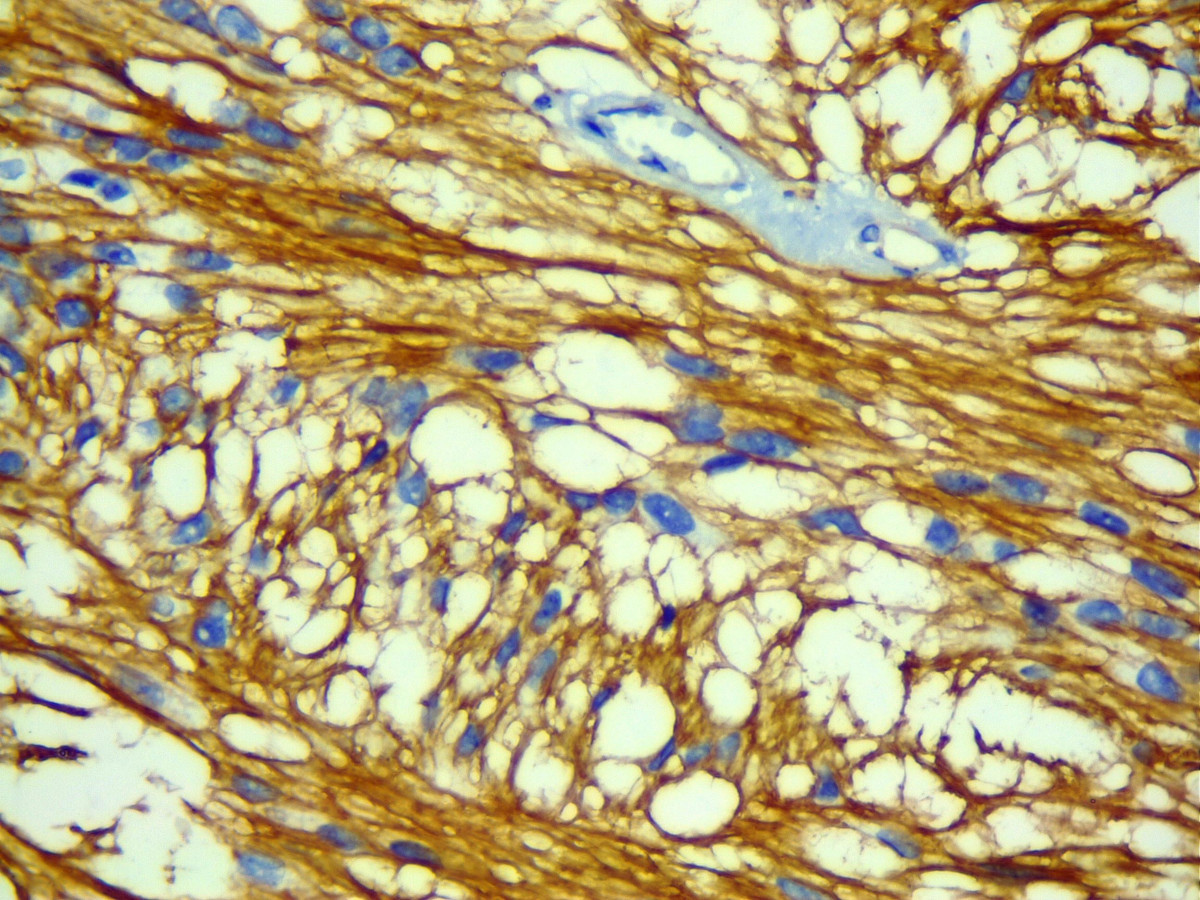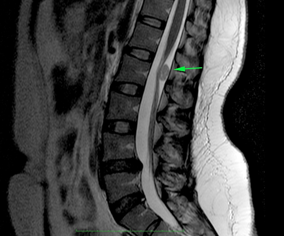 Mujer de 35 años, con parestesias en extremidades inferiores de predominio derecho y dolor a la flexión. Se realizaron estudios de imagen, donde se aprecia una lesión referida de cono medular (se anexan estudios de imagen). Se realizó resección tumoral.