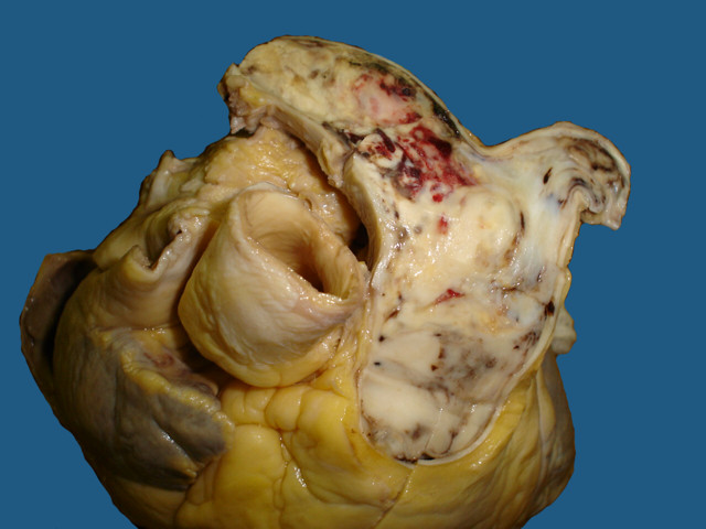 Hombre de 50 años, con hipertensión arterial sistémica y tabaquismo. Dos meses antes de su muerte tos, disnea que progresó a ortopnea y síncope por lo que acudió al hospital. A su ingreso hipotenso, taquicárdico con palidez generalizada. EF: soplo expulsivo en foco pulmonar grado IV/IV.