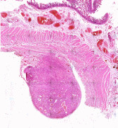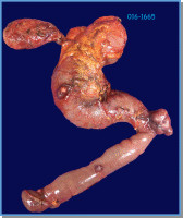 Mujer de 46 años con antecedente de múltiples lesiones en piel (foto 1 Y 2 ) desde la infancia. Inicia su padecimiento con pérdida de peso, distensión abdominal y vómito. La endoscopia mostró lesión ámpula de Váter y la TAC múltiples lesiones en duodeno (Foto 3). Se realizó Whipple. Foto 4.