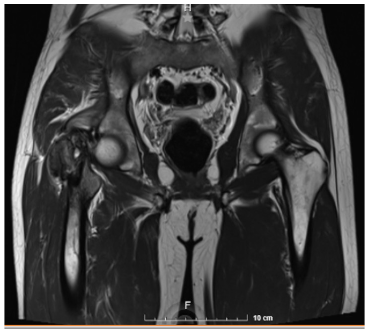 Hombre de 26 años de edad, que acude por dolor en cadera derecha de 10 meses de evolución que no mejora con ingesta de analgésicos. IDx. Quiste óseo.