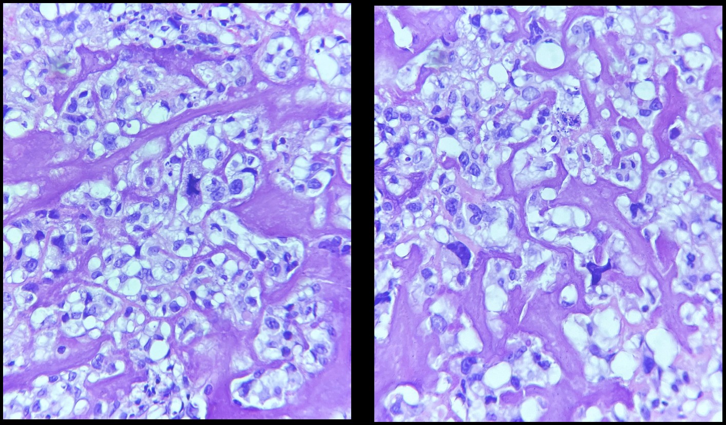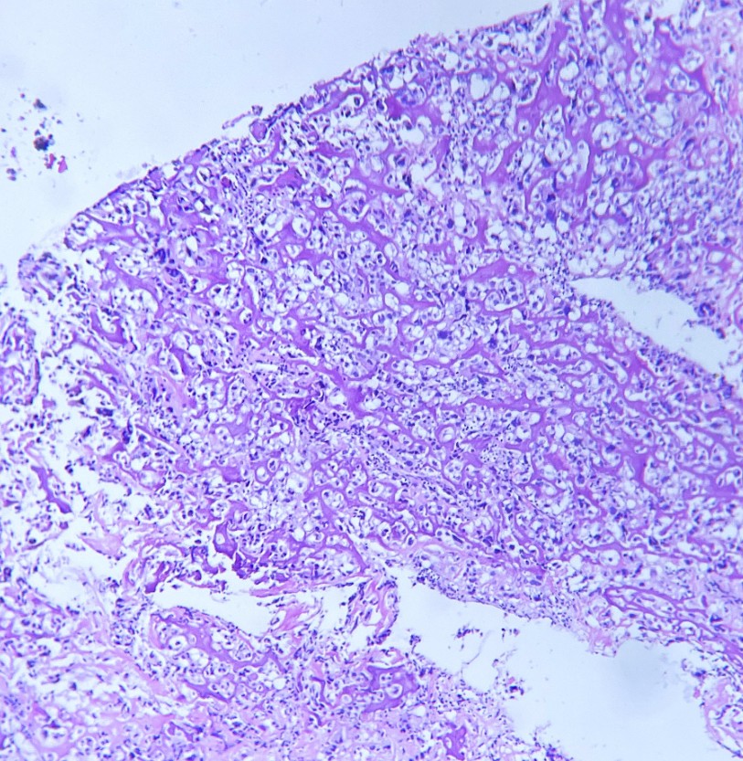 Paciente de 12 años de edad, que acudió por aumento de volumen en miembro pélvico derecho de 2 meses de evolución acompañado de dolor severo que no cedió con analgésicos.