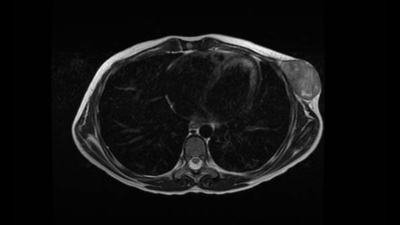 TAC: Lesión a nivel de la región axilar anterior a la altura de los arcos costales 5º y 6º izquierdos; es redondeada, de contornos bien definidos, de aspecto lobulado, hiperintensa en T1 y cuyas dimensiones son de 31 x 50 x 54 mm.